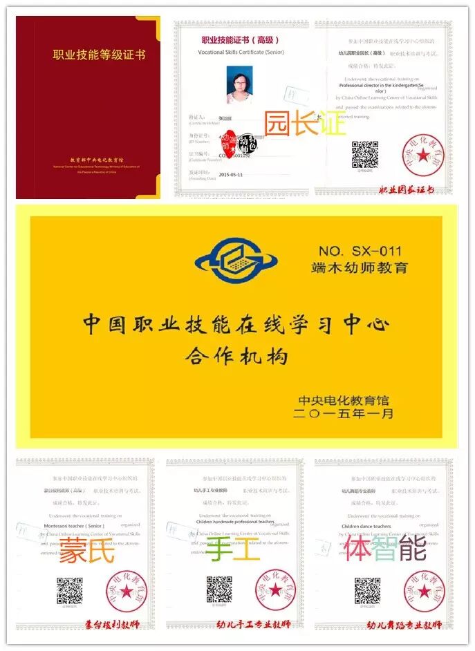 以上所提及的证书都是如上样本,我校作为一个专业的幼师培养学校,在技能学习与认证的收费上价格低廉,技能学习实用性强,授课教师专业,考试认证方便快捷(面授+网络学习&考试)。