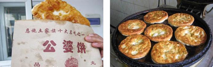 相传,在清朝乾隆年间湖北省鹤峰县一田姓大户人家新娶进门一儿媳妇,公婆饼回门次日按照土家族的习俗要求为公公婆婆进献亲手做的食物,公婆吩咐仆人给儿媳送来麦面二两,粟米少许,作料若干制作早餐。公公要求:“十兄弟每人得到一张饼,且饼与饼之间要互相连着”。婆婆要求:“十兄弟家里的婶婶及其子女都能尝到饼子的口味”。二两麦面制作十张大饼已属不易,还要上百人都尝到饼子的味道更为困难,但聪明过人的儿媳妇却巧妙地解决了公婆所提出的难题,创造了公婆饼,充分展示了其厨艺及其智慧。