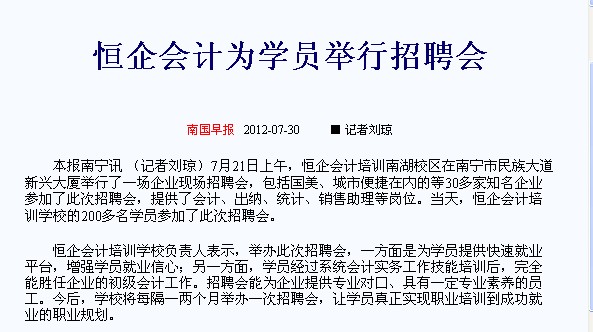 《恒企会计为学员举行招聘会》一文登载在2012年7月30日的《南国早报》第37版
