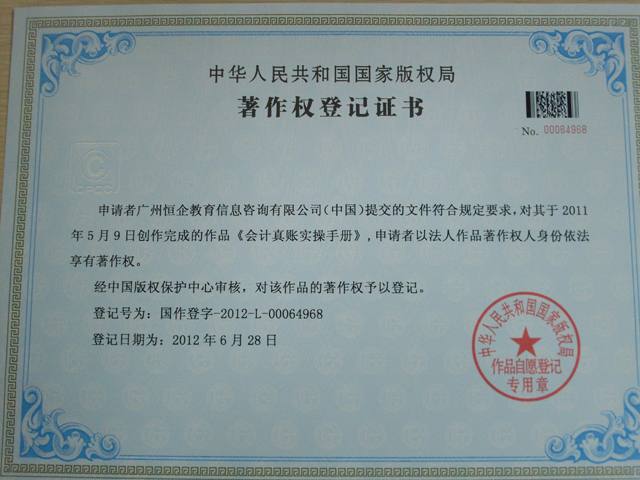 历经近一年的申请审批时间,2012年6月28日,经过国家版权保护中心的审核,由我校课程开发部编著的教材《会计真帐实操手册》成功登记,喜获国家版权保护,再一次彰显了我校在会计真帐实操方面的实力。