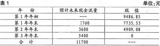 具体会计确认和处理是:第一年的收入为2700元,减值额为1751.32元(9486.85-7735.53),两者的差额948.68元确认为利润,或者是把现值9486.85元的10%的利息948.68确认为利润,这里利润实际上就是现值的利息。同理,第二年收入为3600元,减值 2826.45元,利润773.55元。第三年收入为5400元,减值4909.08元,利润490.92元。会计处理为: