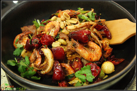 麻辣香锅,主材料选用虾、蟹、田鸡、肥肠等,配上野山菌、青笋、腐竹、土豆等素菜,炒出麻辣鲜香味道,虾鲜、肠脆、肉嫩,笋片清香,腐竹可以吸收各种肉类和海鲜的鲜味,加上本身的香味,混合起来,成就了“一锅香”。内容混搭有荤、有素、有淡、有辣、有自然形成、也有人为加工,看上去已觉天南地北的食材,融入一锅,就如时尚界将五颜六色混搭在一起一样,享受的是丰富与多样。
