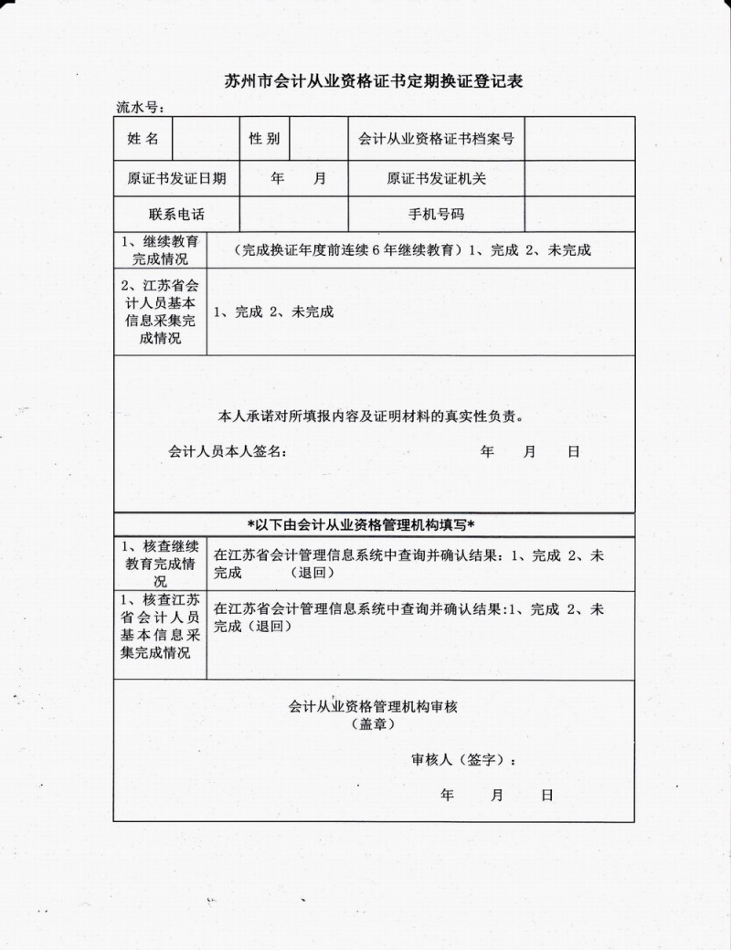 1、填写《苏州市会计从业资格证书定期换证登记表》附件1;