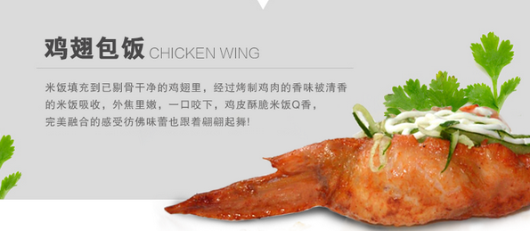 3.鲜明的品牌形象:鸡翅包饭,针对中国本土商圈的消费特性,实施符合商圈的个性设计及产品打造!形象新颖吸引,产品独树一帜,口味在市场反响强烈。
