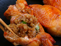 鸡翅包饭源自于一道工艺台湾鸡翅包饭,也叫油包饭,以烧烤形式出现在大众面前。爱吃鸡翅怕骨头,台湾无骨翅包饭,用科学的去骨方法除去你讨厌的骨头,在鸡翅内加入美味的调制糯米,出炉的鸡翅色泽金黄、肉香浓郁、用味独特、美味无限,表面富有光泽,气味鲜香诱人,饱满的鸡肉香味非常能够引人食欲,肉香与Q弹的米香完美的融合在一起,互相衬托不油不腻,使得口味饱满,美味十足!