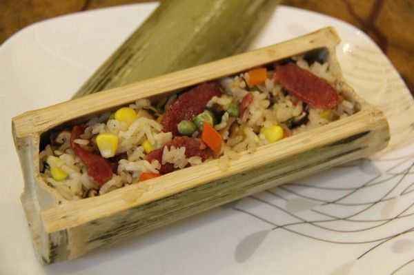 竹筒饭是用山兰稻冲的"香米"并配肉类为原料,放进新鲜的粉竹或山竹锯成的竹筒中,加适量的水,再用香蕉叶将竹筒口堵严,炭火中绿竹烤焦即可。竹筒饭的煮法颇具有野炊特点,即砍下一节竹筒 ,装进适量的山兰米和水,放在火堆中烤熟,当竹筒表层烧焦时,饭就熟了。劈开竹筒,米饭被竹膜所包,香软可口,有香竹之清香和米饭之芬芳。用餐时破开竹筒取出饭,这便是有名的"竹筒香饭"。如果把猪瘦肉混以香糯米和适量盐巴放进竹筒烤成香糯饭,异香扑鼻,是招待贵宾的珍贵美食品。