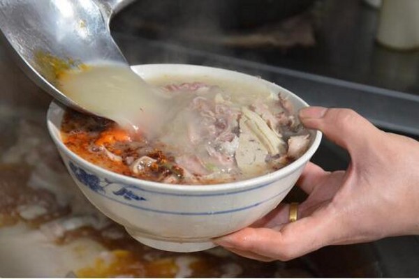 羊肉冲汤是宝丰县最出名的冲汤之一,羊肉冲汤之所以在宝丰当地广受欢迎,大概是因为做法比较特别,冲出来的羊肉不腥不膻,汤味儿也是鲜美十分。案上摆着切好的羊肉、羊头肉、羊肚、羊肠、羊肝、羊肺等等,根据客人的个人爱好往这些大瓷碗里添。羊肉冲滗的次数,冬夏各有讲究,一般夏天五六次便可,冬季就要到八九次了,为的就是把肉和汤更加的入味,让羊肉吃起来更香。