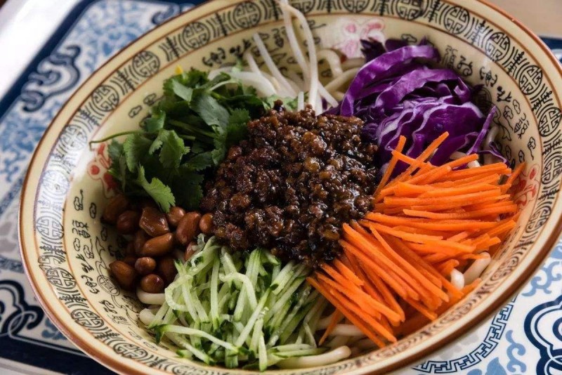 炸酱面是中国传统特色面食。最初起源北京,属山东鲁菜。不过在传遍大江南北之后便被誉为“中国十大面条”之一 ,流行于北京 、天津、山东、河北、辽宁、吉林等北方地区,由菜码、炸酱拌面条而成。将黄瓜、香椿、豆芽、青豆、黄豆切好或煮好,做成菜码备用。然后做炸酱,将肉丁及葱姜等放在油里炒,再加入黄豆制作的黄酱或甜面酱炸炒,即成炸酱。面条煮熟后,捞出,浇上炸酱,拌以菜码,即成炸酱面。也可根据自己的口味加辣椒、醋等调味品。这样会更加符合自己的口味。也有面条捞出后用凉水浸洗再加炸酱、菜码的,称 “过水面”。