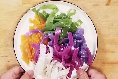 三、凉皮颜色。膳学派凉皮的辣椒油制作极其考究,制作辣椒油时温度一定要把持好、多少度加什么料,加多少克都有明确规定,选用优质菜籽油以及多种调味料,将秘制材料加入其中,上火加热反复熬制而成,其色泽红亮,颜色好看,因而调出来的凉皮红艳如火,清香扑鼻,酸辣爽口,再佐以豆芽、芹菜黄绿相间,堪称绝配!