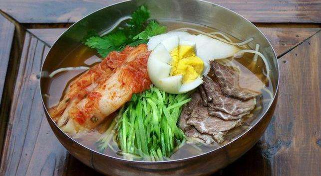 朝鲜冷面(俗称朝鲜面、韩国冷面) 是驰名国内外的一种深受人们喜欢的传统民族食品。其中尤以荞麦面冷面为著称。一般用牛肉汤或鸡汤,佐以辣白菜、肉片、鸡蛋、黄瓜丝、梨条等。食用时,先在碗内放少量凉汤与适量面条,再放入佐料,最后再次浇汤。其面条细质韧,汤汁凉爽,酸辣适口。