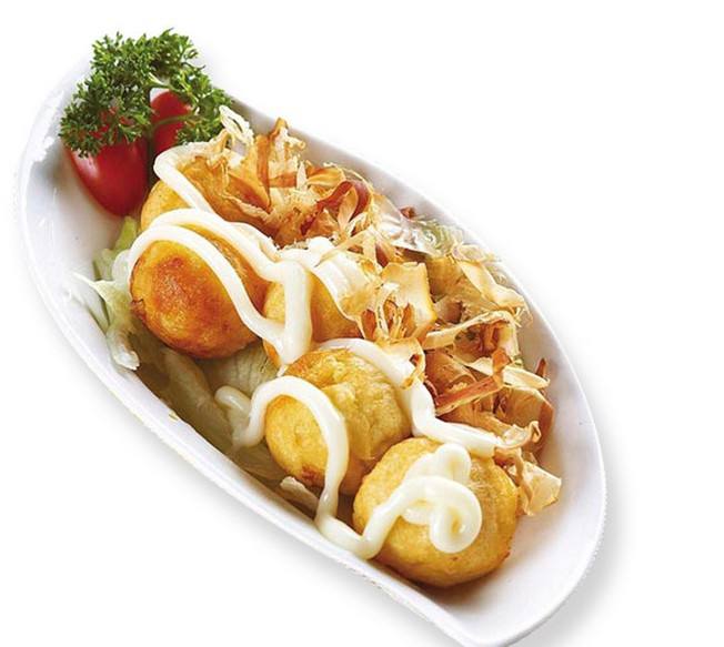 章鱼烧,起源于日本大阪 ,又名章鱼小丸子,成份主要是章鱼、章鱼烧粉、柴鱼片、海苔、沙拉酱、章鱼烧酱等。