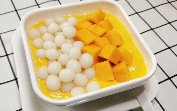 5、冷藏好的芒果浆里倒入适量的小汤圆和西米,再放上剩下的芒果粒,按照个人爱好浇上酸奶或者炼奶或者椰汁即可。