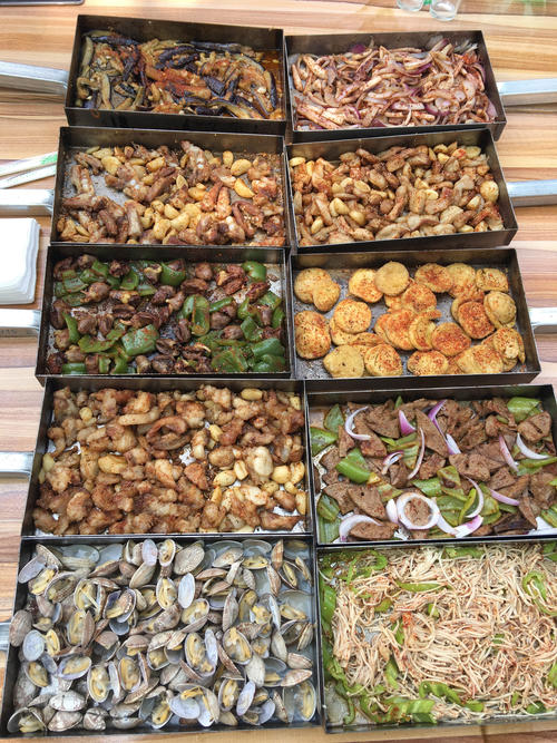 见过这个吗?曾经在李村大集上向阳路桥底下,那时候他们主要是做加工,我记着好像是5块钱一斤。李村大集已经没有了搬到别的地方改成农贸市场了,但是这个戳子肉还是保留了下来就在原先那个桥西边的狗市一条街里,一共有3家这次吃的是王喜铁板烧。下班约好朋友聚齐大约是7点多,门口已经坐了很多人了,而且还在不断的有人来。现在还可以自己买菜加工,但是已经没有当时大集上守着菜市场那么方便,所以现在一般都是去了直接点菜偶尔会买一些新鲜的海鲜带着。