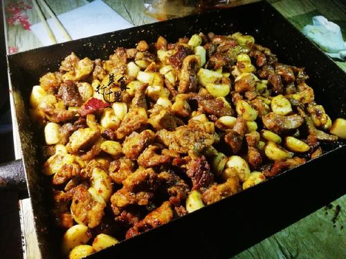 个人推荐的是五花肉,一份是2斤也可以要半份,肥瘦相间的五花肉和很多很多的大蒜一起烤其实应该是煎或者是炸。戳子里的肉滋滋的响,而肉香和蒜香也交织在一起散发出来。五花肉肥瘦相间肥肉部分香而不腻,瘦肉部分紧致有嚼劲,我最喜欢吃的是里面的大蒜绵软浓香没有任何的辛辣之味。这一份五花肉量非常足,很多吃惯了精致美食的美女都非常喜欢吃。