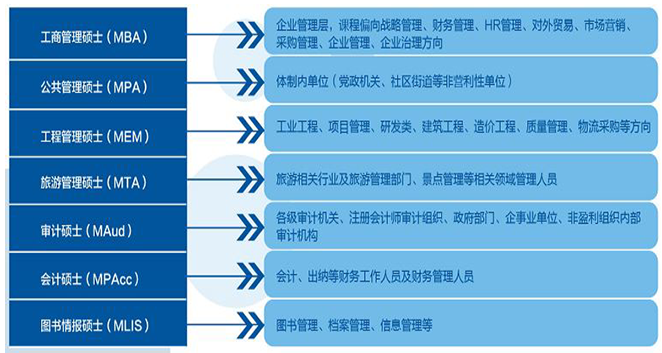 目前考研辅导课程涵盖:工商管理硕士(MBA)、公共管理硕士(MPA)、会计专业硕士(MPAcc)工程硕士(GCT)、工程管理硕士(MEM)、审计硕士(MAud)、图书情报硕士(MLIS)、旅游管理硕士(MTA)等多个项目。