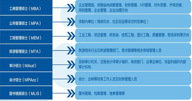 目前考研辅导课程涵盖:工商管理硕士(MBA)、公共管理硕士(MPA)、会计专业硕士(MPAcc)工程硕士(GCT)、工程管理硕士(MEM)、审计硕士(MAud)、图书情报硕士(MLIS)、旅游管理硕士(MTA)等多个项目。