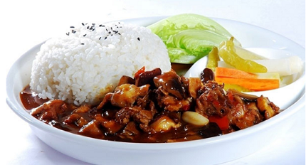 盖浇饭,是一种古老的汉族小吃。属于西北甘肃地区叫法,东北叫烩饭,广东叫碟头饭,还有的地方只是叫咖喱土豆饭,咖喱鸡饭,麻婆豆腐饭,番茄蛋饭,番茄牛肉饭等等,以此类推这样子,其实都是菜和饭放在一个盘子里吃,菜浇在饭上,由此称作盖浇饭。
