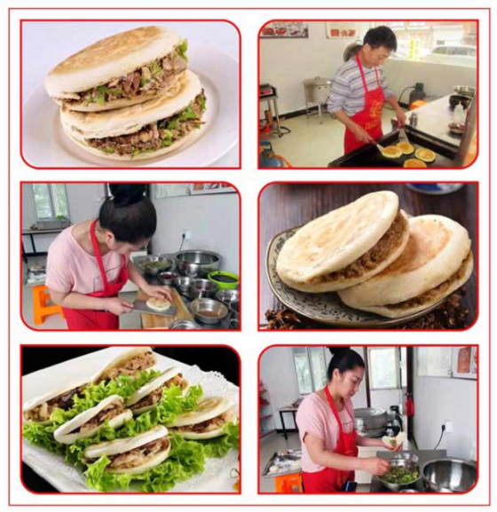 传授全套技术,手把手传授全套技术,现场实际操作,包括所有核心调料配方全无保留,从面粉的选料到配比、和面、醒面、烤馍、卤肉、出品及所有细节流程、调料采购渠道,肉夹馍开店经营问题的解答等等。