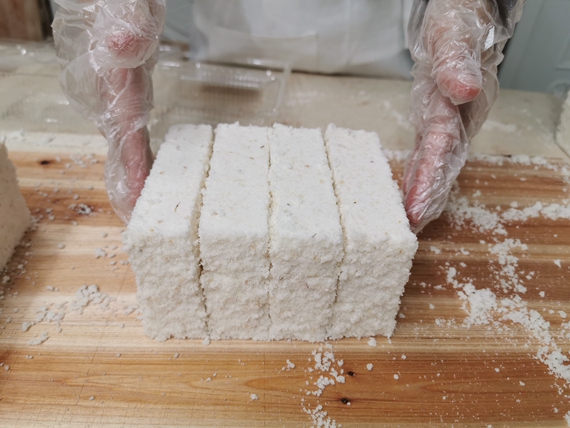 3拉起呈此状态,如果底部结块了,马上从热水拿出来,用蛋抽不停搅拌,结块就会打散,这时发现粉浆已经变稍稠。