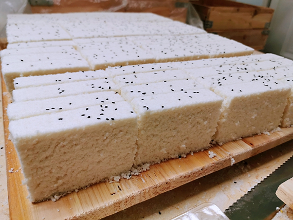 10. 在30cm的高度倒入米糊,轻振模具,放入已烧开水的蒸锅里,中火蒸35分钟左右。