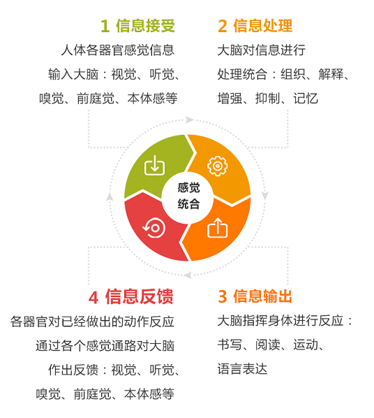 感觉统合是指将人体器官各部分感觉信息(如视觉、听觉、触觉、嗅觉、前庭觉和本体觉等)输入组合起来,经大脑处理(解释、比较、增强、抑制、联系和统一),对身体外的知觉做出反应,并反馈指导行为、语言、思维等的能力。