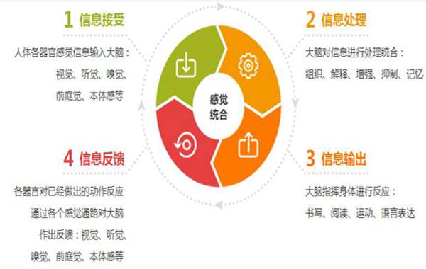 感觉统合是指将人体器官各部分感觉信息(如视觉、听觉、触觉、嗅觉、前庭觉和本体觉等)输入组合起来,经大脑处理(解释、比较、增强、抑制、联系和统一),对身体外的知觉做出反应,并反馈指导行为、语言、思维等的能力。