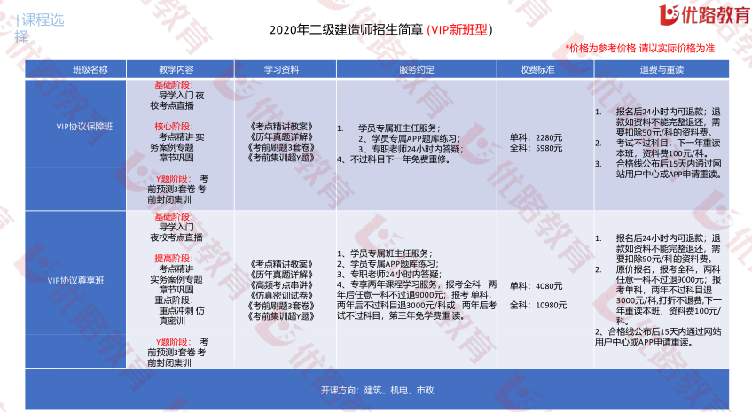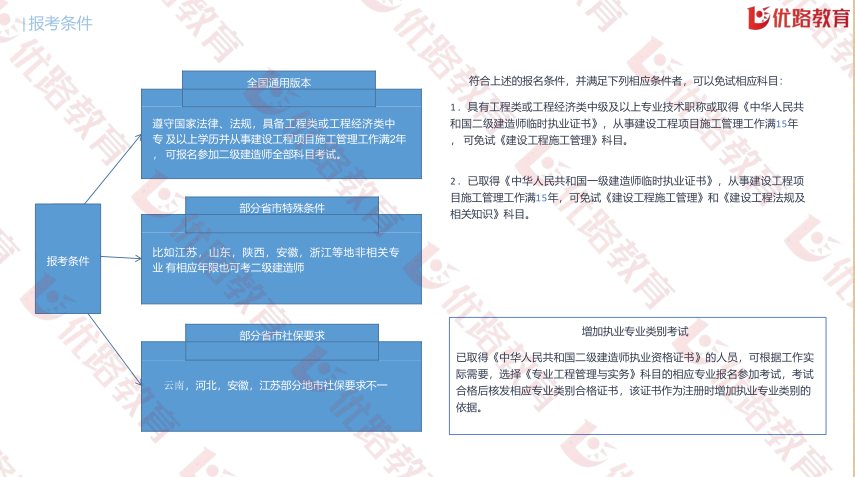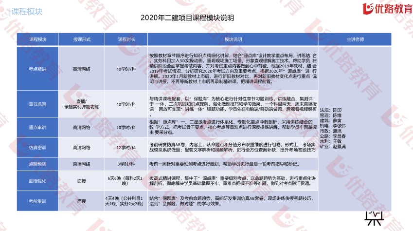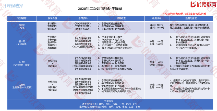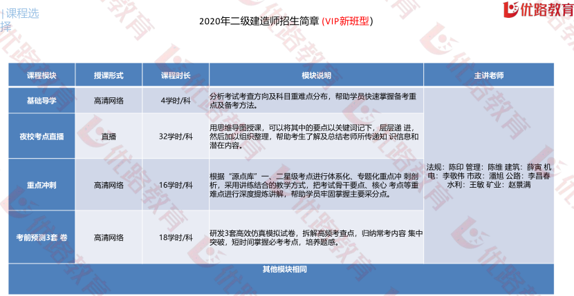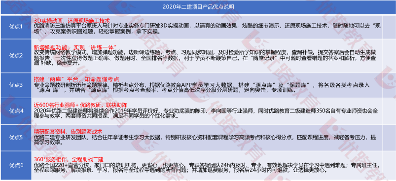 优路教育品牌主要从事工程、财经、教师行业准入类职业(执业)资格认证培训业务、专本科学历继续教育业务。包括:建设工程类执业资格考前培训,如建造师、消防工程师、工程师、造价工程师、监理工程师、咨询工程师(投资)、安全工程师、环境影响评价师等认证培训;财经类职业资格考试培训,如中级经济师、中级会计师、银行招考、银行从业资格、证券从业资格等认证培训;教师类资格考试培训,如教师资格证、教师招聘考试、特岗教师考试等。