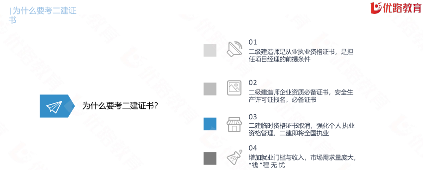 二建全国执业趋势,证书含金量上升,每年将以50万的报考量增长,报考人数多竞争加剧,国家严控通过率;