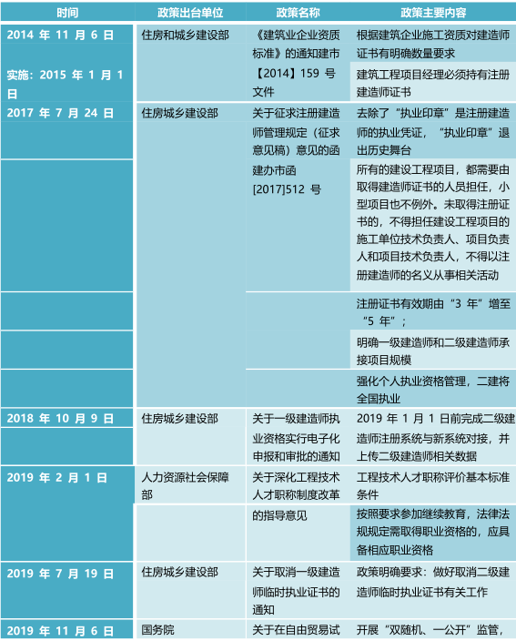 1. 政策规定对建筑行业逐步规范,专业技术人员必须持有执业资格证书,企业资质也对资
