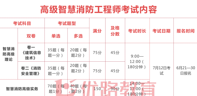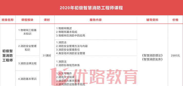 以上是南京优路教育为你整理关于消防工程师培训课程介绍,如需了解更多的培训班、课程、价格、试听等信息,您可以点击在线客服,也可以在线留言,我们课程顾问会尽快联系您,为您定制专属课程,开始您的学习之旅。