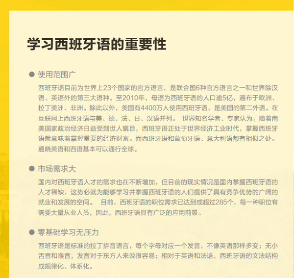 课程内容 :听,说,读,写同步训练。 系统性地学习西语语言知 识,深入工作,经济,文 化,环境,政治等领域,穿 插跨文化交际知识。能够流 畅地表达自己的观点和计 划,回复邮件等