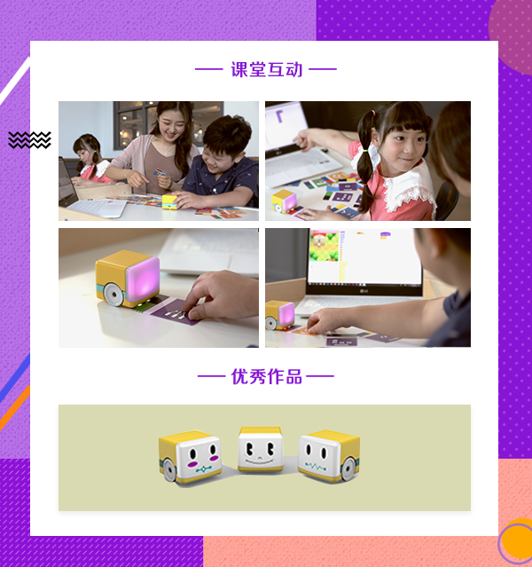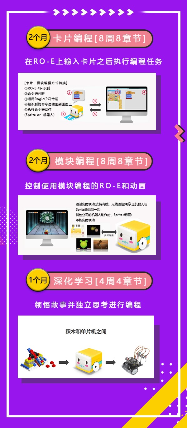 使用RO-E机器人作为教学器材,集步进马达、LED、 蜂鸣器、触碰开关、红外线传感器、颜色传感器于体的智能教育机器人。RO-E设计成可爱的卡通形象,使小朋友们在学习过程中觉得更为亲切。