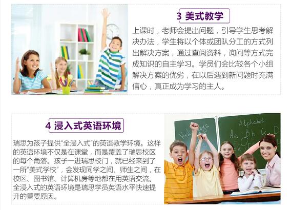 瑞思英语使用美国霍顿:米夫林哈考特教育集团历时多年斥巨资打造的课程及教材。瑞思少儿英语课程完整、连续,充分遵循孩子的认知规律,知识点及学习方法由浅入深。整体学习过程中,英语语言、学科知识、英语思维、应用能力如螺旋般提升。