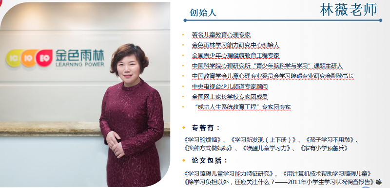 金色雨林创始人林薇女士与中科院心理研究所博士生导师、荷兰莱顿大学儿童心理学博士张雨青教授于1994年开始研究儿童学习能力,同年创办北京雨林学习能力研究开发中心;并于1999年,成立北京金色雨林学习能力研究中心。2014年,北京金色雨林教育科技有限公司成立。金色雨林隶属于东方加慧(北京)教育科技有限公司。长久以来,金色雨林致力于为3-14岁的儿童提供学习能力培养。 在长期的实践中金色雨林形成了一套成熟的学习能力训练体系“个性化教育方案”( Individual Educational Program, 简称 “IEP”) 。 通过测评系统,判明孩子的学习能力状况,采用针对性的学习能力训练方案,并辅以家庭教育咨询,心理素质辅导,帮助孩子提升学习能力。