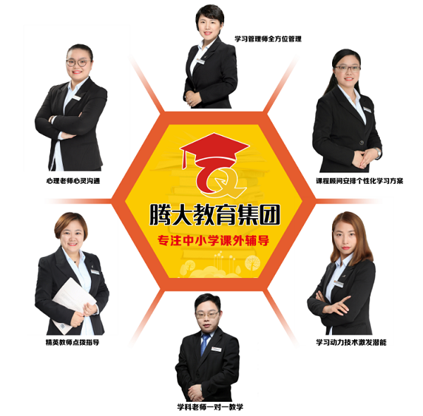 “好老师,好方法,好成绩”,好老师是好成绩的保证,腾大视“教学质量是企业的生命”。腾大拥有一支强大的教研、教学队伍,其中初高中一线教师占80%以上,很多教师凭借丰富的中、高考出题与批卷经验,能够准确把握考试方向,帮助了众多学子跨入理想的学府。此外,腾大 还特聘重点大学师范大学资深教育专家,不定期对学员进行学习动力激励、学习兴趣培养、改善亲子关系、青春期心理疏导,配合家长对学生进行全方位心理调节,为学生的心理健康保驾护航。一路走来,腾大教师团队兢兢业业,遵守“敬业、奉献”的教学原则,培养出大批优秀学子,深得学生家长信任,在业界树立了典范标杆和极佳的口碑!