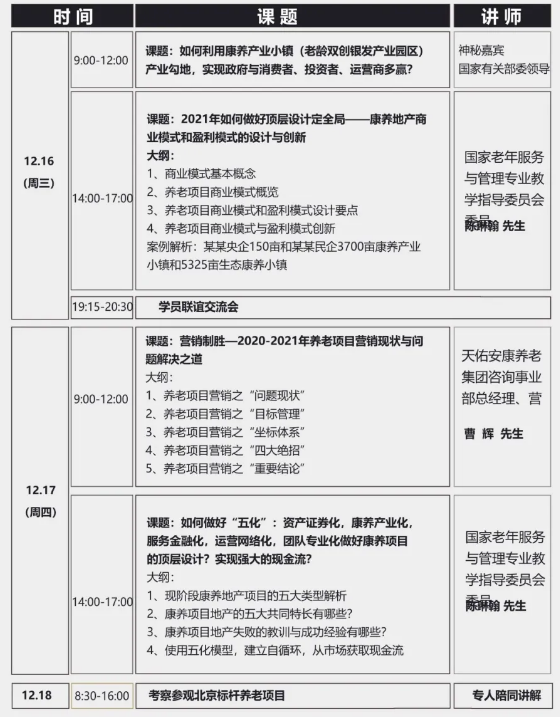念,截止2020年,成功举办高管研修班50期,院长训练营50期,培训了3000多名中高端养老人才。同时,致力于为广大企业家们整合养老产业相关资源、提供高端人脉资源,打造终身学习交流平台,帮助企业家们更好理清思路,避免重走弯路,共同成就我们的养老事业,为中国康养产业的发展做出应有的贡献。