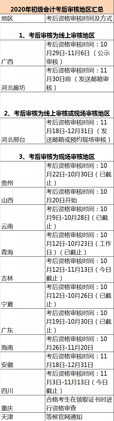 2020初级会计职称各地区考后资格审核时间汇总
