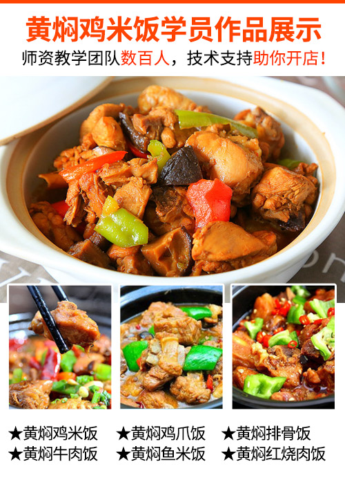 黄焖鸡、黄焖全过程;原料存放、保鲜技术;原料的进货渠道指导。教学品种有黄焖鸡腿饭、黄焖全鸡、黄焖鸭、黄焖排骨、黄焖红烧肉、黄焖牛腩、黄焖鱼头等。