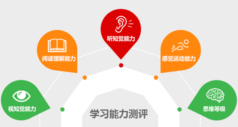 针对学龄儿童,从感觉运动能力、听知觉能力、视知觉能力和思维等级、 阅读理解能力五大方面判断孩子的学习能力水平。