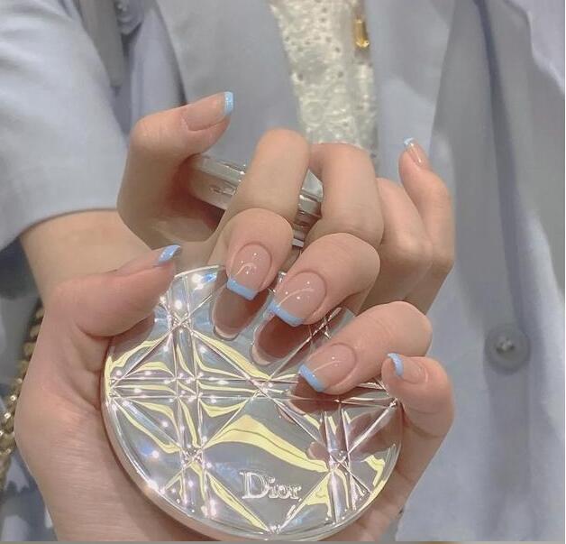 这一款美甲的配色让人不自觉的想到独角兽,它是以非常清透的裸粉色作为打底,这个颜色和甲面本身的颜色非常相似,所以看起来非常自然透亮。法式边是非常清新的粉蓝色,这个颜色比较浅,看起来十分温柔同时还带着一点点活泼的感觉。