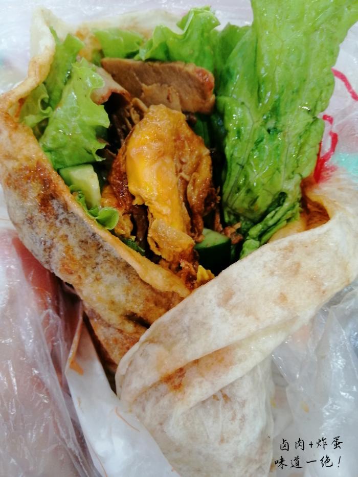 卤肉卷超级好吃,鸡蛋是炸过的很吸味道。卤肉瘦肉偏多,我很喜欢。因为我本身不吃肥肉。先是一个饼刷上酱,然后铺上生菜和黄瓜,再加上选择的料(我选了卤肉+炸鸡蛋),整体一个蛮大的,吃完也可以吃饱。卤肉的汤汁已经整体慎入面饼了。所以不用担心味道不足或者干。