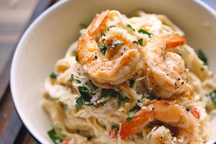 主料:虾仁150克、意大利面、洋葱、帕玛森奶酪、淡奶油。