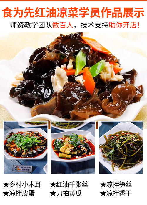 凉菜具有口味干香,脆嫩,爽口不腻,色泽艳丽等特点。很多人都喜欢去店里面点这不同于其它的口味。现场师傅示范实际操作教学,教技术配方实操。红油凉菜品种多,以素菜为主,所以利润也高。好的技术、材料制作出来的味道很好,汤汁浓郁,卫生干净,就给人一种别有味道的感觉,吃起来味道好。
