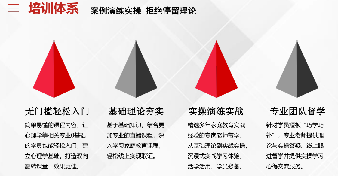 家庭教育指导师培训班,家庭教育指导师是指通过教育、应用心理学、社会家庭理论知识,帮助家庭建立良好的家庭环境,通过改变孩子的生活、学习习惯,建立孩子的道德和责任,帮助家庭幸福的专业人员。