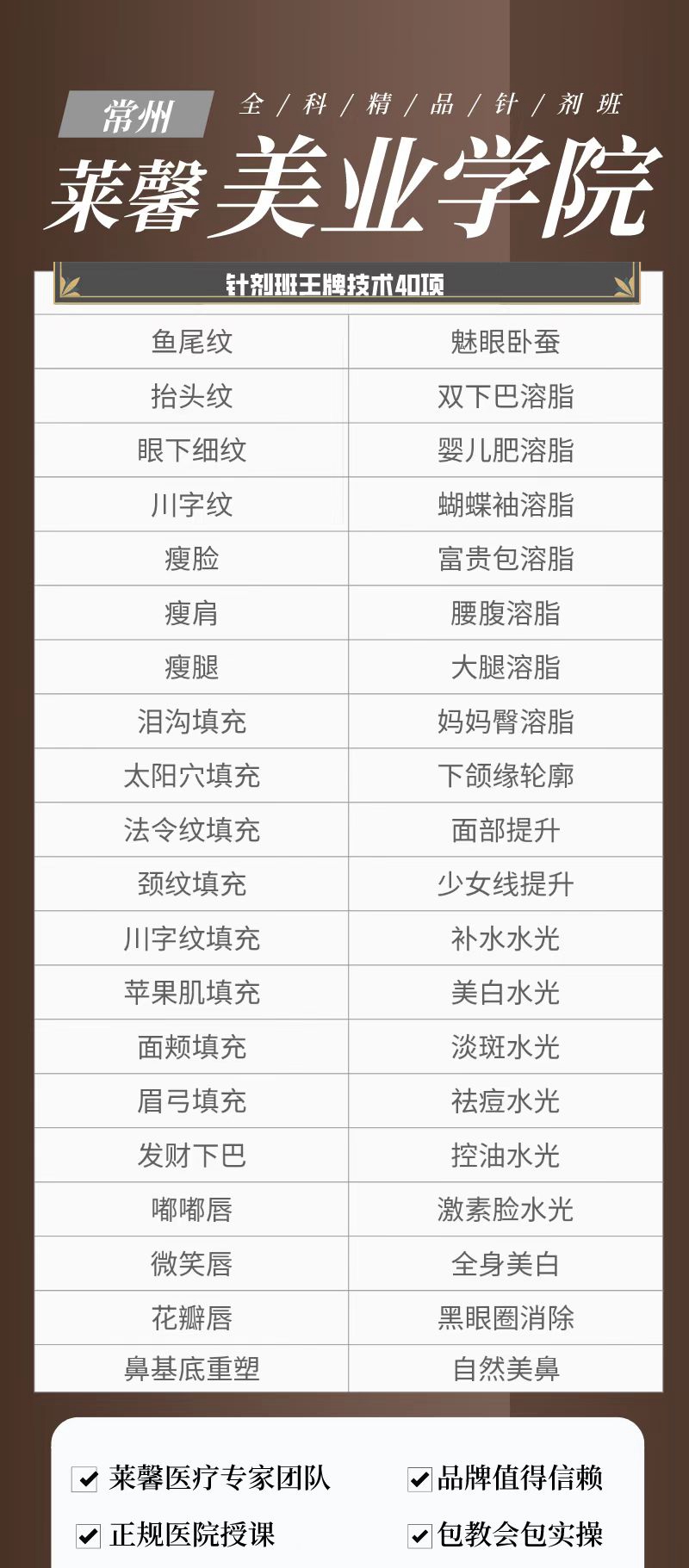 「莱馨美业」微整培训学校,精品小班教育!精品教学,基础理论结合一对一操作!注重实际操作,可以跟班来学习,也可以随到随学,总之让您学会为止,想学真本领的快快报名吧!老师一站式教学!手把手指导!包教*!如果你对微整形感兴趣,或者你已经在从事相关的业务但并顺利,又或者你对于这个行业完全处于零基础的阶段,我们的课程都能让你找准自己在微整市场上的定位!