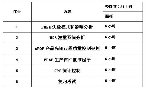 4、通过学习,让同学们熟练掌握该体系中:APQP、PPAP、FMEA、MSA、SPC五大核心工具。