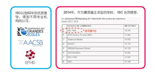 法国巴黎高等商业学院(ISC Paris)成立于1963年,是一所坐落在巴黎的私立法国商学院,也是法国50所精英商学院之一,旨在培养高素质的商业管理人才、能适应国际化大环境的人才。学院颁发的文凭获得法国国民教育部认可, 并得到广泛的国际承认。2014年ISC高商硕士项目的综合指标位列第16名,ISC还被评为企业认可度最高的学校,位列第一。