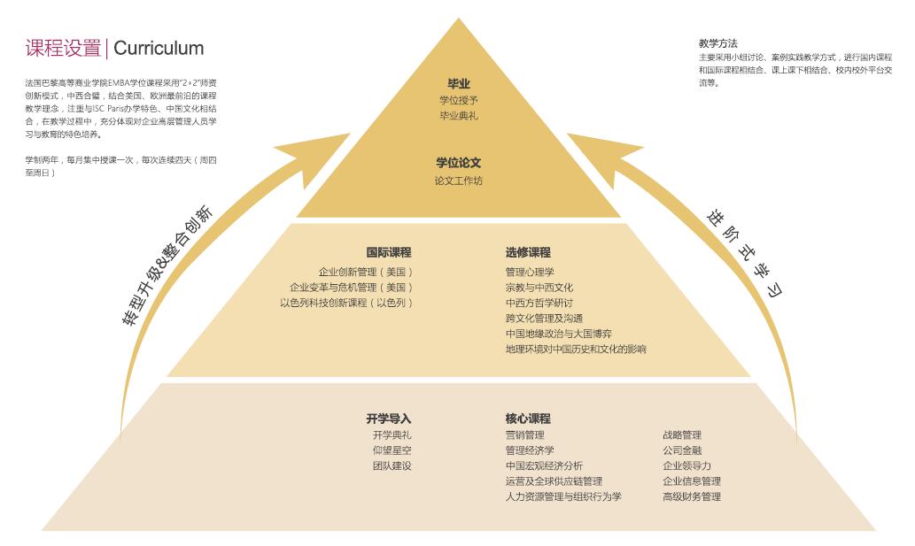 法国巴黎高等商业学院ISC Paris EMBA项目采用“2+2”中西合璧办学模式,结合美国、欧洲最前沿的课程设置,注重与中国大背景相结合,与ISC Paris办学特色相结合,在教学过程中,充分突出对高层管理人员学习与教育的特色培养。
