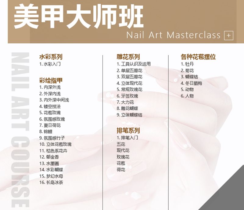苏州美甲大师课程,通过以实践为主,理论为辅的教学,掌握美甲师技能技术是基本的要求,同时培养具有专业知识以及潮流时尚审美,能够独立完成各种美甲工作。